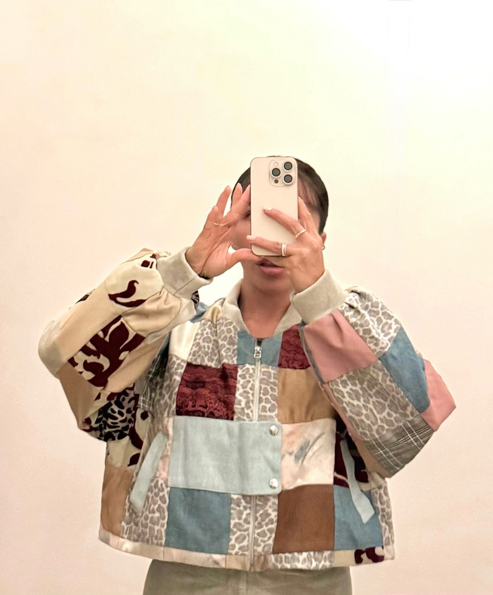 Cada prenda mantiene el mismo diseño base, pero los fragmentos de tela varían: colores, texturas y combinaciones se eligen de manera aleatoria y cuidadosa, creando una versión irrepetible de cada WORLD.